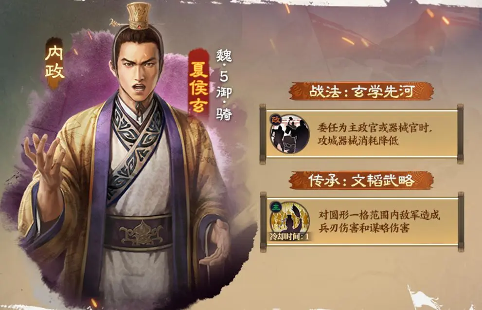 夏侯玄,内政武将,降低攻城器械的消耗,这个效果有用但不多,投石车那点资源不多,而且除非攻坚不然很难用到大量资源去建造新的投石车。