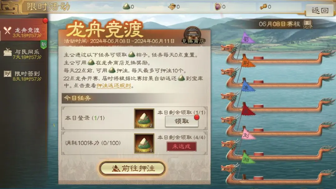 ·活动规则:每日完成活动任务可获得节日道具「粽子」,参与龙舟竞猜有机会获得更多「粽子」,「粽子」可在限时商店内兑换招募信等奖励