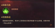 其中 绝境潜能-受到致命伤害时,有30%几率5秒内无敌并回复10%的生命值。60秒冷却时间(仅pvp生效)